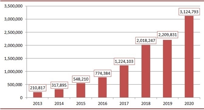 2013년 이후 연평균 47%의 높은 성장률을 보이고 있으며, 2020년 기준 신차 대비 점유율이 4%로 나타나고 있다.